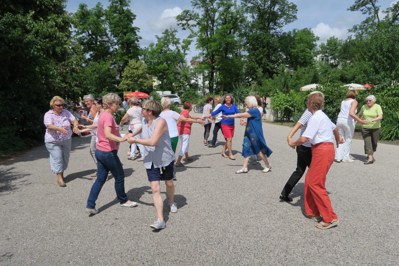 Wir, die Tanzgruppe aus Bad Sauerbrunn, duften mit Tanzleiterin Mary Morawitz am 09.Juni einen ganz besonderen Tagesausflug erleben. Gleich nach der Ankunft im Niederösterreichischen Kirchberg am Wagram erwartete uns bei perfektem Wetter ein vielfältiges Gartenfrühstück im Naturschaugarten „Alchemistenpark“. Danach erweiterten wir unser Wissen mit einer Gartenführung, wo wir Obst- und Nussraritäten kennen lernten, mit zahlreichen „Alten Sorten der Zukunft“ wie Nashi-Birne, Kaki, Chinesische Himbeere oder Schneeballfrüchten. Um 11 Uhr gestaltete unser Gründungstanzleiter (2000-2009) Robert Lhotka einen dreißigminütigen „Tanzgruß an Kirchberg am Wagram“(Bild). Er begleitete uns auch weiter nach Tulln. Im Restaurant „Die Gärtnerei“ freuten wir uns über die Zweiglein und Blätter liebevoll dekorierten Speisen direkt aus dem Küchengartl. Den Nachmittag nutzten wir zuerst für eine Gartenführung mit Robert. Wir lernten die ökologische Gartenschau „GARTEN TULLN“ mit ihren vielfältigen Mustergärten kennen, erklommen auch den Baumwipfelweg mit dem Ausblick über das Tullnerfeld und die Gärten. Besonders sind uns die 4 jungen Schwäne, der kühle Brise in 30 Meter Höhe und die bunten Wiesenflächen aus lokalem Saatgut in Erinnerung geblieben. Nach einigen schwungvollen Tänzen und lieben Begegnungen mit Tanzfreundinnen und Freunden aus Niederösterreich traten wir erschöpft, aber glücklich die Heimreise an. Es war eine schöne Verbindung aus Garteneindrücken und unserer Lieblingsbeschäftigung dem Tanzen, danke Robert!