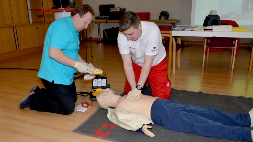 Schock kann lebensrettend sein. Das Üben mit dem Defibrillator und die praktische Anwendung an der Übungspuppe