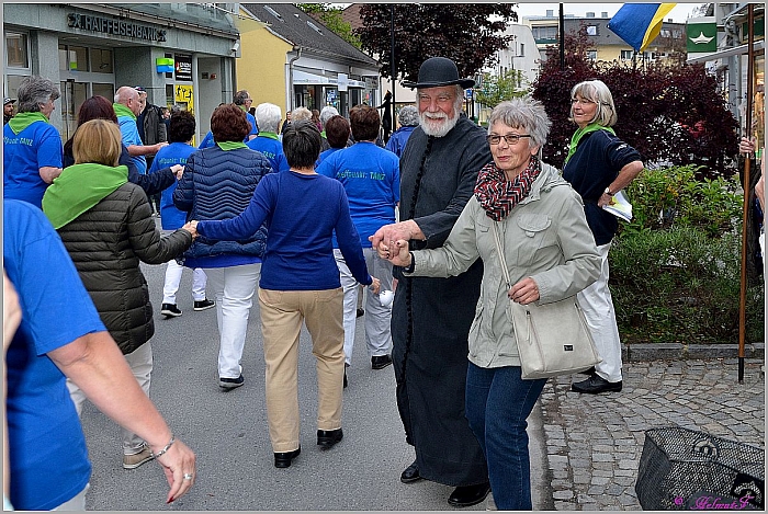 Eine letzte Tanzprobe gab es noch vor dem Keller auf der Straße, ohne Musik, nur zu Marias Ansage. Alles klappte, und so marschierten wir, angeführt von unserem Herrn „Pfarrer“ KNEIPP auf die Bahnstraße. Da am selben Abend die „lange Einkaufsnacht“ in Gänserndorf stattfand, waren jede Menge Leute unterwegs. Als wir mit unserer Tanzpräsentation begannen, gab es daher viele Zuseher, die begeistert applaudierten, Zugaben forderten und im Rhythmus klatschten. Das entspannte uns und wir tanzten eine Stunde lang mit Freude von einfachen Rounds, einem Kontratanz in der Gasse, über die Amalienpolka bis zum Toblana Eck im Square, Mixer und Lines und natürlich auch Tänze mit dem Publikum.